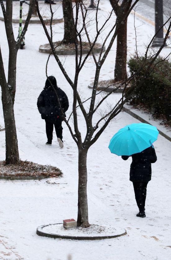 목요일인 22일 광주와 전남 지역에 아침 기온이 -10도 안팎까지 떨어지는 강력한 한파가 예보됐다. 사진은 21일 광주 서구 치평동에서 시민들이 눈이 내리고 있는 거리를 걷고 있는 모습. 연합뉴스