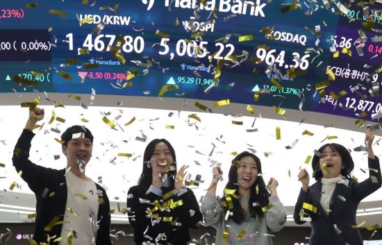 코스피가 꿈의 지수 '5000'을 돌파한 22일 서울 중구 하나은행 딜링룸에서 직원들이 기뻐하며 박수를 치고 있다.