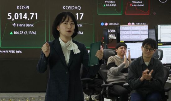코스피가 꿈의 지수 '5000'을 돌파한 22일 서울 중구 하나은행 본점 딜링룸에서 직원들이 기뻐하며 박수를 치고 있다. 이날 코스피는 전장보다 77.13포인트(1.57%) 오른 4987.06으로 출발해 곧바로 5000선을 넘어섰다. 이는 지난해 10월27일 4000포인트를 넘어선지 채 3달이 되지 않아 이룬 성과다.