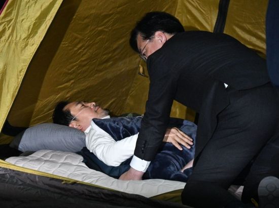 송언석 국민의힘 원내대표가 22일 국회 로텐더홀에서 통일교·공천헌금 '쌍특검' 수용을 요구하며 여드레째 단식 중인 장동혁 대표를 살펴보고 있다.