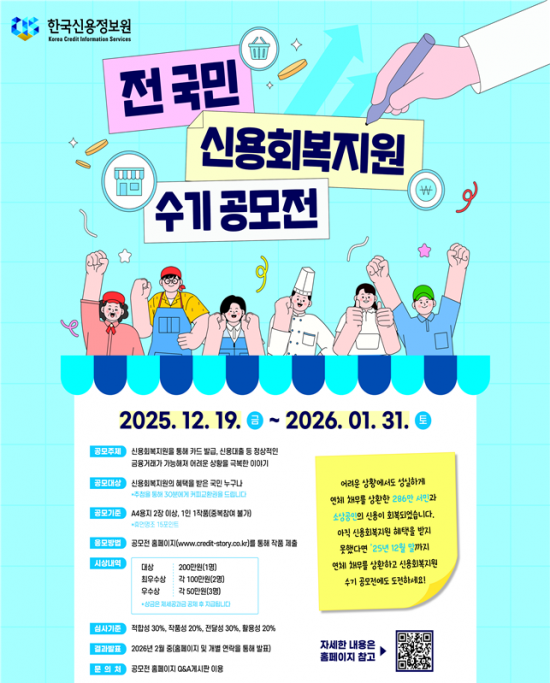 한편 한국신용정보원은 이번 조치를 통해 신속하게 금융생활로 복귀한 경험을 공유하고 정책 체감도를 높이기 위해 지난달 '전 국민 신용회복지원 수기 공모전'을 개최해 31일까지 신용회복 경험을 접수하고 있다. 이번 공모전은 신용회복지원 혜택을 받은 국민 누구나 참여 가능하며, 수상자에게는 소정의 상금도 수여된다.