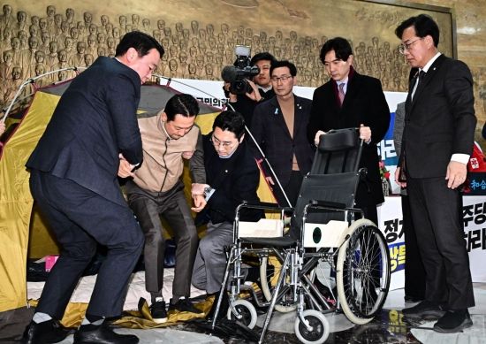 여드레째 단식을 이어오던 장동혁 국민의힘 대표가 22일 국회 로텐더홀에서 단식을 중단한 뒤 병원으로 이동되고 있다.