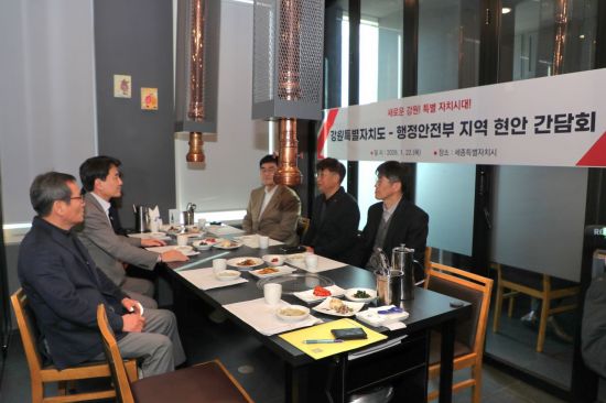 김진태 강원특별자치도지사는 22일 세종시에서 도 출신 행안부 고위 관계자들과 간담회를 갖고 강원특별법 3차 개정안의 조속한 처리와 민통선 북상 관련 국비 지원 등 도내 핵심 현안을 논의했다.
