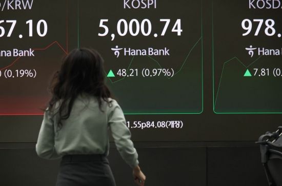 코스피가 장중 5000선을 재돌파한 가운데 23일 서울 중구 하나은행 본점 딜링룸에서 직원이 증시와 환율 등을 모니터하고 있다. 이날 코스피는 전 거래일(4952.53)보다 31.55포인트(0.64%) 상승한 4984.08에 장을 시작했다. 2026.1.23 조용준 기자