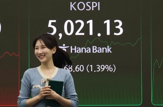 코스피가 장중 5021.13으로 사상 최고가를 경신한 가운데 23일 서울 중구 하나은행 본점 딜링룸에서 직원이 증시와 환율 등을 모니터하고 있다. 이날 코스피는 전 거래일(4952.53)보다 31.55포인트(0.64%) 상승한 4984.08에 장을 시작했다.