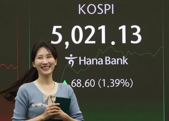 코스피가 장중 5021.13으로 사상 최고가를 경신한 가운데 23일 서울 중구 하나은행 본점 딜링룸에서 직원이 증시와 환율 등을 모니터하고 있다. 이날 코스피는 전 거래일(4952.53)보다 31.55포인트(0.64%) 상승한 4984.08에 장을 시작했다.