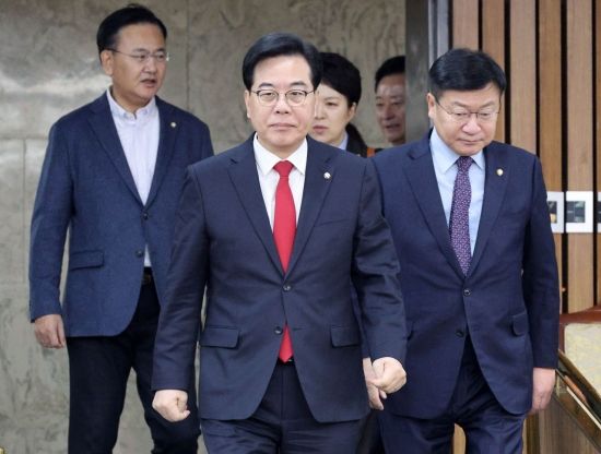 송언석 국민의힘 원내대표가 23일 국회에서 열린 원내대책회의에 참석하고 있다.