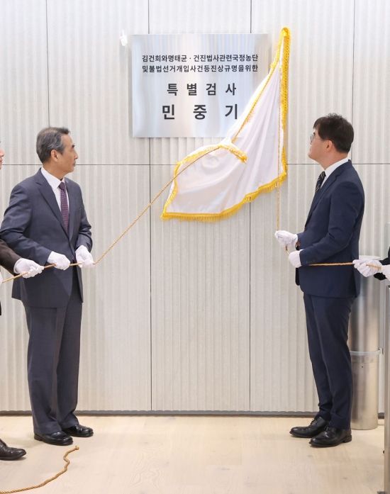 윤석열 전 대통령의 부인 김건희 여사 의혹 관련 사건을 맡은 민중기 특별검사를 비롯한 특검보들이 2일 서울 종로구 KT광화문빌딩 웨스트에 마련된 특검 사무실에서 현판 제막을 하고 있다. 2025.7.2 조용준 기자