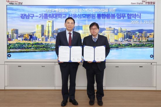 강남구는 지난 23일 구청에서 서울성모병원과 '강남구 통합돌봄 가정형 호스피스 협력사업' 업무협약을 체결했다고 26일 밝혔다. 자치구와 상급종합병원이 연계해 가정형 호스피스를 지원하는 체계를 공식화한 첫 사례다.