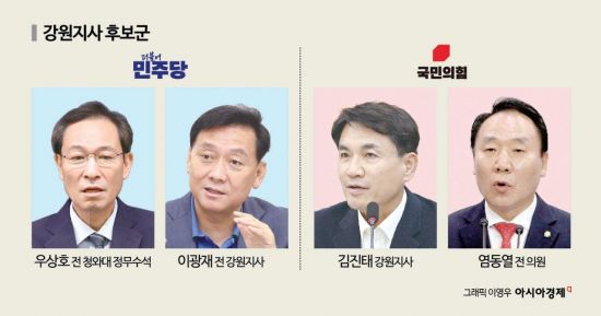 오는 6월3일 제9회 전국동시지방선거에서 강원도지사 선거는 김진태 지사에 맞서 우상호 전 청와대 정무수석, 이광재 전 강원지사 등이 도전하는 형태로 초반 구도가 형성되고 있다.