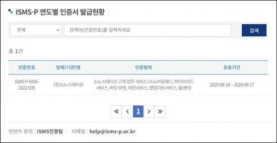 소노스테이션은 2022년 ISMS-P 인증을 처음 취득한 뒤 지난해 8월 재인증을 통해 인증 유효기간을 2028년 8월까지 갱신했다. 인증 범위에는 소노아임레디를 비롯해 하이브리드 서비스, 버킷마켓, 의전서비스, 영업지원 서비스, 콜센터 등 고객 업무 전반이 포함됐다.