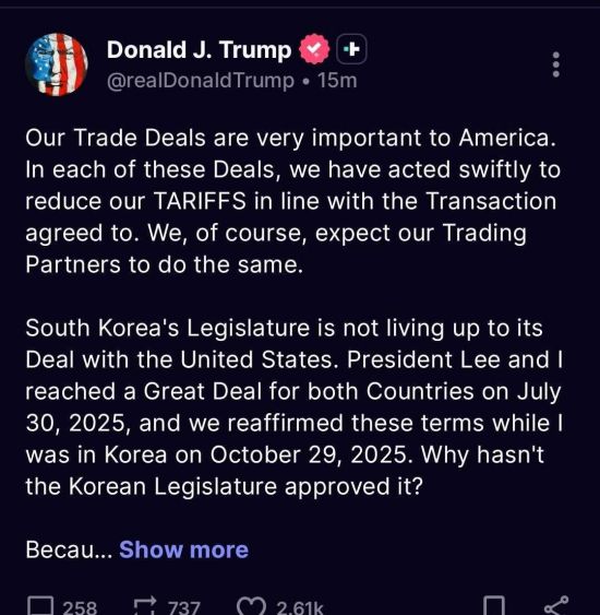 또 "이재명 대통령과 난 2025년 7월 30일에 양국을 위한 위대한 합의를 했고, 내가 2025년 10월 29일 한국에 있을 때 그런 조건을 재확인했다"며 "왜 한국 입법부는 합의를 승인하지 않았는가"라고 물었다.