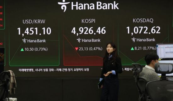 한국산 제품에 대한 관세를 무역합의 이전으로 되돌리겠다는 도널드 트럼프 미국 대통령의 발언에 코스피가 하락 출발한 27일 서울 중구 하나은행 본점 딜링룸에서 직원이 증시와 환율 등을 모니터하고 있다. 2026.1.27 조용준 기자