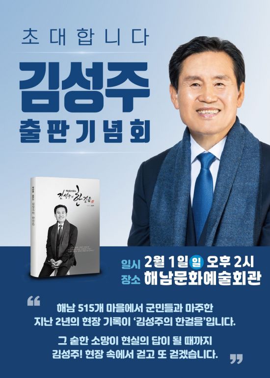 김 전 조합장은 오는 2월 1일 오후 2시 해남문화예술회관에서 자서전 '김성주의 한걸음' 출판기념회를 연다. 이번 자서전에는 515개 마을 투어, 14개 읍면 상가투어 등 현장에서 마주한 군민들의 목소리와 민생 현안이 담겼다.