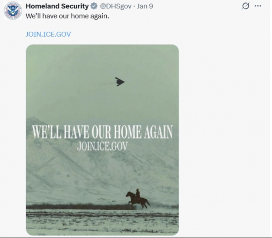연합뉴스는 27일(현지시간) 뉴욕타임스(NYT)를 인용해 "미 국토안보부는 최근 백악관과 함께 인스타그램, 페이스북, 엑스(X·구 트위터) 등에 게시한 이민세관단속국(ICE) 공동 채용 광고에 '우리는 우리의 집을 되찾을 것'(WE'LL HAVE OUR HOME AGAIN)이라는 문구를 넣었다"고 보도했다.