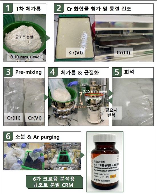 6가 크로뮴 분석용 규조토 분말 인증표준물질(CRM) 제조 과정. 시중에 판매되는 규조토 분말을 1차 체가름한 뒤 3가 크로뮴(Cr(III))과 6가 크로뮴(Cr(VI))을 첨가하고, 동결건조와 반복 체가름을 거쳐 시료를 균질화했다. 이후 안정성 유지를 위해 아르곤(Ar) 분위기에서 소분·포장했다. 연구진 제공