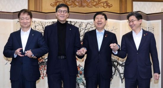 구윤철 부총리 겸 재정경제부 장관 등 경제수장들이 29일 서울 종로구 정부서울청사에서 열린 확대거시경제금융회의에서 참석해 기념 촬영을 하고 있다. 왼쪽부터 이찬진 금감원장, 이창용 한국은행 총재, 구 부총리, 이억원 금융위원장.