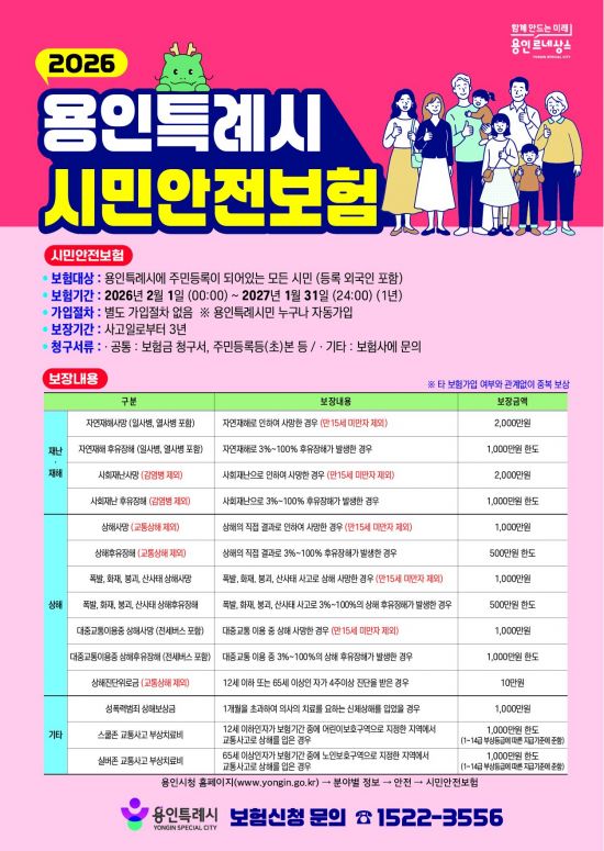 경기도 용인시는 각종 재난과 사고로 피해를 본 시민의 생활 안정을 지원하기 위한 '시민안전보험'에 가입했다고 2일 밝혔다.