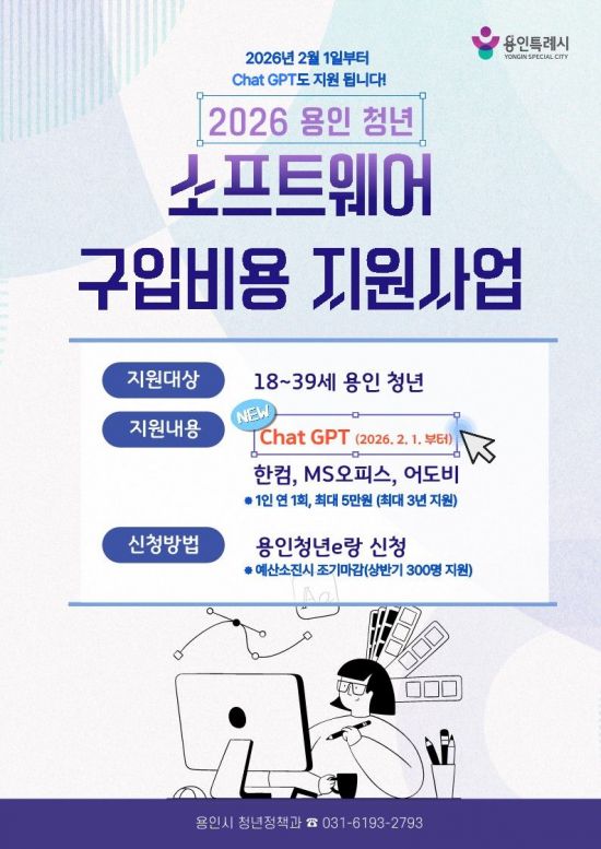 용인시는 청년들의 디지털 역량 강화를 위해 '청년 소프트웨어 구입비용 지원사업' 대상 품목에 '챗 GPT 플러스'를 추가했다고 2일 밝혔다.