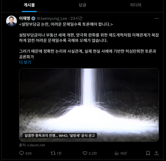 이 대통령은 지난 1일 자신의 사회관계망서비스(SNS) 엑스(X·옛 트위터)에 "설탕부담금 도입 여부에 대해 깊이 있고 냉철한 논쟁을 기대한다"고 썼다. 지난 28일 첫 언급 이후 재차 설탕세 도입 의지를 밝힌 것이다. 야당에서 사실상 증세라는 비판이 제기된 데 대해서는 "세금이 아닌, 국민의 건강보험료 부담을 줄이는 것"이라며 토론을 제안했다. 이에 대해 청와대는 "설탕 섭취로 인한 국민건강권 문제 및 지역·공공의료 강화를 위한 재투자 재원으로의 활용 방안 등에 대해 각계 의견을 수렴해 검토해나갈 계획"이라고 밝혔다.