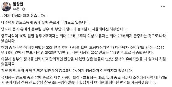 이날 임 청장은 페이스북에 "다주택자 양도세 중과 유예가 종료될 경우 세금 부담이 얼마나 늘어날지 시뮬레이션 해봤다"며 이같이 말했다. 다주택자 양도세 중과 유예 종료를 앞두고 세정당국 수장이 직접 세금 증가 규모를 언급하며 세제 정상화의 필요성을 강조한 것이다.