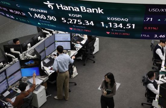 5일 서울 중구 하나은행 본점 딜링룸에서 직원이 증시와 환율 등을 모니터하고 있다. 이날 코스피는 전 거래일(5371.10)보다 120.07포인트(2.24%) 하락한 5251.03에 원·달러 환율은 10.8원 오른 1461.0원에 장을 시작했다. 2026.2.5 조용준 기자