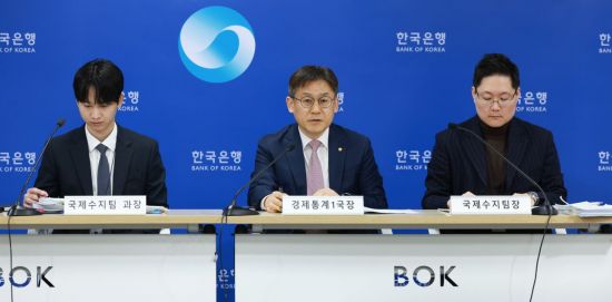 (왼쪽부터)김준영 국제수지팀 과장, 김영환 경제통계1국 국장, 박성곤 국제수지팀장이 6일 서울 중구 한국은행에서 열린 '2025년 12월 국제수지(잠정)' 기자설명회에서 발언하고 있다. 한국은행