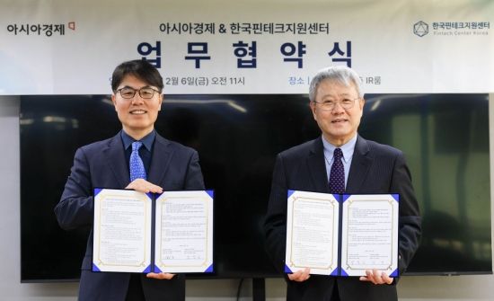 장범식 아시아경제 대표(오른쪽)와 김건 한국핀테크지원센터 이사장이 6일 서울 마포구 프론트원에서 열린 '아시아경제-한국핀테크지원센터, 디지털자산 및 핀테크 산업 협력 업무협약식'에 참석해 업무협약을 마친 뒤 기념촬영 하고 있다.