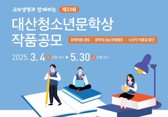 이번 제33회 대산청소년문학상은 응모작품(시 5편, 소설 원고지 60장 내외 1편)과 소속 학교장의 추천서(비재학 청소년의 경우 소속단체장 추천서)를 온라인 접수하면 된다.