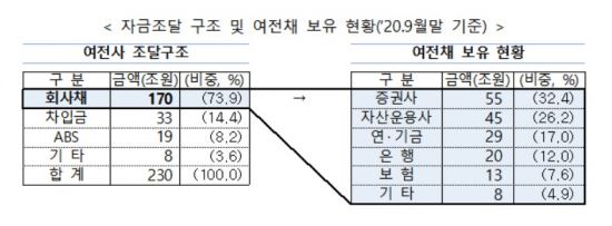 여전사는 수신기능 없이 여신업무만을 영위하는 캐피탈사 등 금융회사다. 수신기능이 없다보니 외부차입, 회사채, ABS 발행 등을 통해 자금을 조달하는데 특히 회사채(여전채) 발행비중이 높으며 이런 구조는 여전사가 부실화될 경우 여전채를 보유한 금융회사 등으로 부실이 전이·확대되는 문제가 있다.