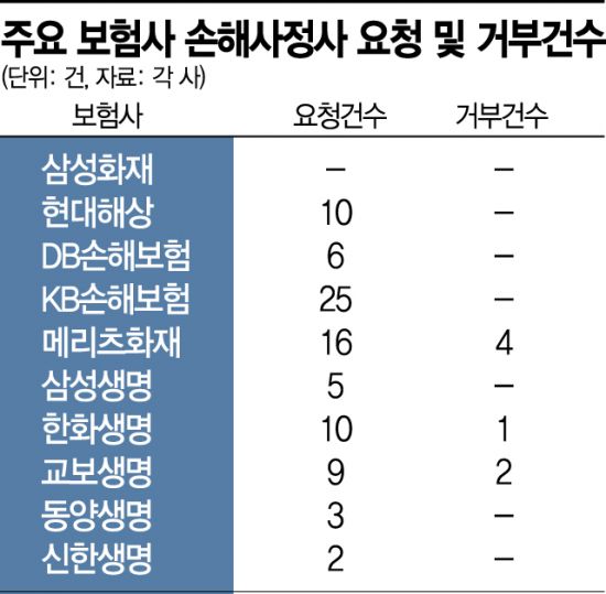 손해사정사 선임 요청을 거부한 사례도 있었다. 메리츠화재 4건, 교보생명 2건, 한화생명 1건 등이다.