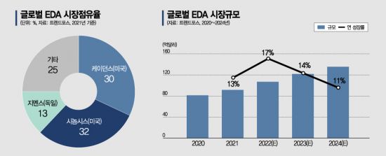 EDA는 인공지능(AI) 머신러닝(ML) 자율주행 분야 등에 쓰이는 첨단 반도체의 생산성을 높이는 데 필요한 설계·테스트·검증 필수 소프트웨어다. 설계 자산(IP), 디자인하우스, OSAT(후공정) 등과 함께 파운드리 주요 공급망 속에서 긴밀히 맞물려 돌아가는 영역이다. 대만 시장조사기관 트렌드포스에 따르면 EDA 시장 점유율은 시놉시스(32%), 케이던스(30%) 등이 쥐고 있다. 독일 지멘스(13%)까지 포함해 '세계 3대 EDA 기업'이라고 부른다. EDA 시장은 2020년 81억달러(약 10조6000억원)에서 2024년 136억달러(약 17조8000억원)로 성장할 것으로 전망된다.