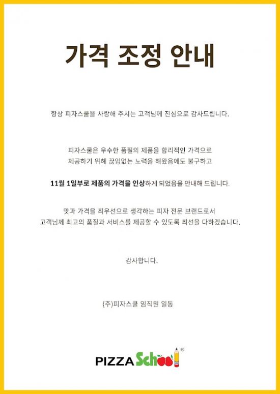 2일 업계에 따르면 피자스쿨은 홈페이지에서 안내문을 통해 “우수한 품질의 제품을 합리적인 가격으로 제공하기 위해 끊임없는 노력을 해왔음에도 불구하고 11월 1일부로 제품의 가격을 인상하게 됐다”고 밝혔다.