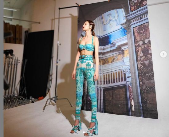 사진 속 나나는 화려한 무늬가 돋보이는 의상을 입고 카메라 앞에서 포즈를 취하고 있다.