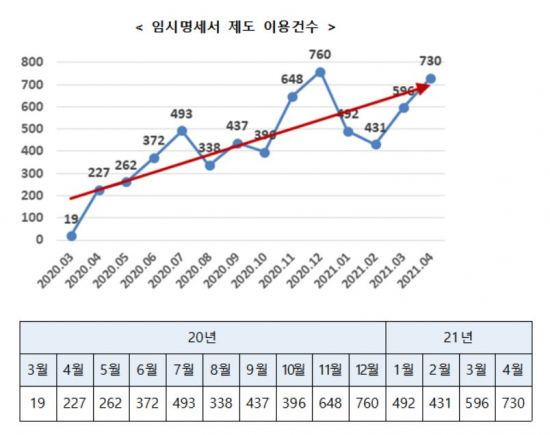 이 제도는 지난해 3월 3일부터 도입·시행됐다. 임시명세서 이용건수는 지난해 4월 227건에서 지난달 730건으로 3.2배 급격히 늘어난 것으로 조사된다. 이는 특허점유 속도가 중요시 되는 4차 산업혁명 관련 신산업 분야에서 임시명세서가 빠른 특허출원의 도구로 활용되는 점을 방증한다.