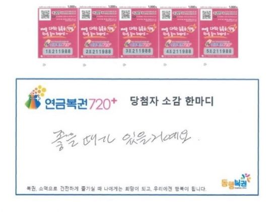 복권 수탁사업자 동행 복권은 9일 홈페이지에 연금복권 720+ 207회차 1등 당첨자의 인터뷰를 공개했다. 당첨자 A씨는 "재미와 기대감으로 복권을 구매하고 있다"며 "어느 날 복권판매점에서 어르신이 연금복권을 구매하는 모습을 보고 연금복권은 어떤 상품인지 궁금해 몇 장 구입했다"고 말했다.