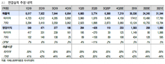 이안나 이베스트투자증권 연구원은 "올해 3분기 실적은 매출액 6368억원, 영업이익 119억원으로 각각 전년 대비 17%, 69% 하락했다"며 "타이어 보강재의 섬유부문은 중국에 이어 미국 자동차 시장 회복으로 가동률이 상승하면서 흑자 전환했다"고 설명했다.