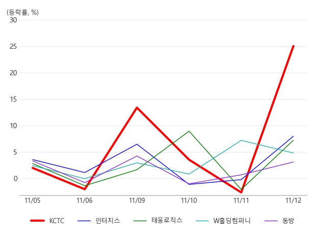 12일 종합 물류 테마가 전일 대비 3.00% 상승하면서 강세를 보이는 가운데 관련주로 주목받고 있는 KCTC이 전일 대비 25.04% 상승하며 급등하고 있다. KCTC은 항만하역, 운송 등을 영위하는 종합물류기업으로 알려져 있다.