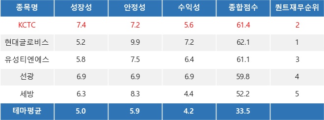 씽크풀 로보알고리즘 RASSI의 분석에 따르면, KCTC은 성장성, 안정성, 수익성 모두 테마의 평균 점수를 상회하면서 퀀트 재무 순위 2위(총 16종목)를 차지했다. 이는 재무적인 측면에서 테마 내 다른 종목들에 비해 KCTC의 투자 매력도가 높은 편이라고 해석될 수 있다.