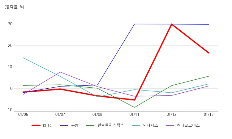 13일 종합 물류 테마가 전일 대비 3.04% 상승하면서 강세를 보이는 가운데 관련주로 주목받고 있는 KCTC이 전일 대비 16.44% 상승하며 급등하고 있다. KCTC은 항만하역, 운송 등을 영위하는 종합물류기업으로 알려져 있다.