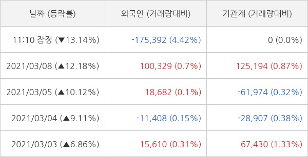 오늘 외국인은 17만 5392주 순매도 하는 것으로 잠정 집계되고 있다. 최근 5일 동안 개인 투자자들은 11만 5988주 순매도 했고, 외국인과 기관은 각각 3만 8168주 순매수, 11만 9491주 순매수 했다.