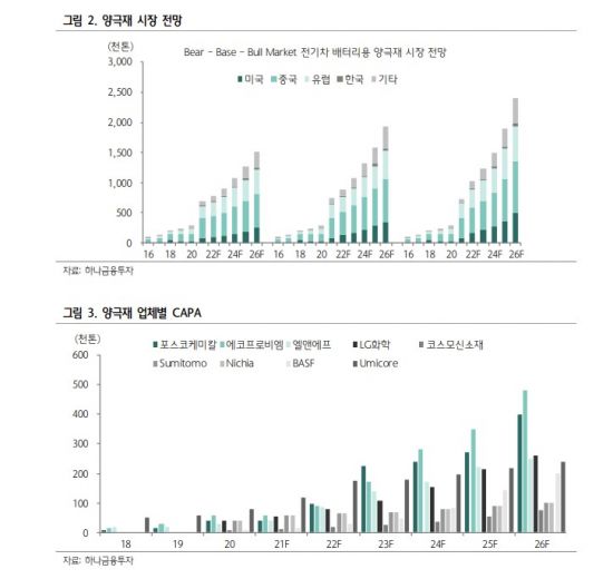 중장기 목표치를 2023년 17만t으로 제시한 바 있는데(2023년 100GWh CAPA 대응 가능한 물량이라고 표현해서 제시, 약 16~18만t으로 환산 가능), 이후 2년 반 동안 중장기 가이던스를 제시하지 않고 있다. 김 연구원은 "국내 업체들의 중장기 양극재 생산능력 가이던스가 포스코케미칼 2023년 22.5만t, 2026년 40만t, 에코프로비엠 2023년 17만t, 2026년 48만t으로 제시된 것, 최근 1년간 해당 수치들이 가파르게 상향 조정된 것을 감안할 때, 현재 양극재 시장에서 한국 업체들이 점유율을 높여가는 과정에 있다고 판단한다"고 강조했다.