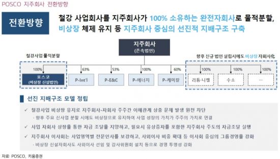 포스코는 지난 10일 이사회에서 포스코홀딩스(지주회사, 존속법인)와 포스코(사업회사, 신설법인)의 분할을 결정했다. 분할 방식은 포스코홀딩스가 포스코의 지분 100%를 보유하는 물적분할이며 분할 후 포스코홀딩스만 상장이 유지되고 포스코는 비상장으로 남게 된다. 내년 1월28일 임시주주총회를 통과할 경우 3월1일자로 분할이 완료된다. 회사가 밝힌 지주회사 분할 목적은 철강 중심 사업 구조의 한계를 극복해 그룹 성장을 가속화하고 인식의 개선을 통해 신성장사업에 대한 기업가치 재평가를 위한 것이다.