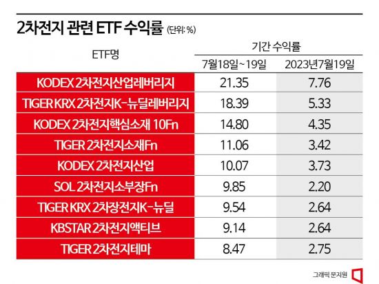 KODEX 2차전지산업레버리지는 18~19일 이틀 새 21.35% 폭등했다. 같은 기간 TIGER KRX2차전지K-뉴딜레버리지는 18.39%, KODEX 2차전지핵심소재10 Fn은 14.8%, TIGER 2차전지소재 Fn은 11.06% 상승했다.