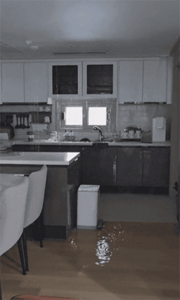 영상을 보면 주방 천장에서 물이 쉴 새 없이 쏟아진다. 1층 공동현관문 역시 마치 누군가가 뿌리는 듯 물이 흘러내린다.