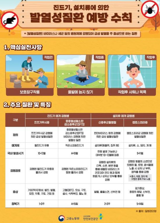 고용노동부 산하 안전보건공단은 야외작업자의 진드기 등으로 인한 감염병 예방을 위해 홍보전을 펼치고 있다.