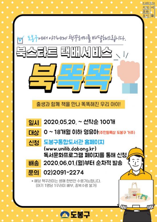 [Asia Economy Reporter Park Jong-il] Dobong-gu (Mayor Lee Dong-jin) is implementing a delivery service called ‘Book Ddok Ddok’ to allow infants and toddlers to safely receive Bookstart packages at home in response to the spread of COVID-19.