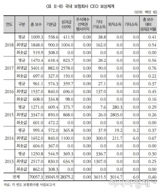 Meanwhile, the research team collected and organized compensation data for executives and CEOs from 34 insurance companies (23 life insurance and 11 non-life insurance) that disclosed executive compensation in business reports and annual compensation system reports from 2013, when disclosure of executive compensation for listed companies began, through 2018.
