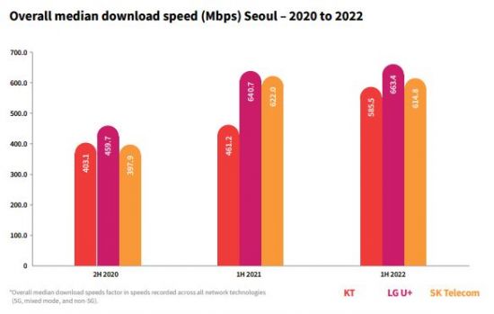 In Seoul, LG Uplus recorded the fastest download speed using a combination of 5G, LTE, and 5G-LTE hybrid networks at 663.4 Mbps (megabits per second). SK Telecom followed with 614.8 Mbps, and KT was third at 585.5 Mbps.