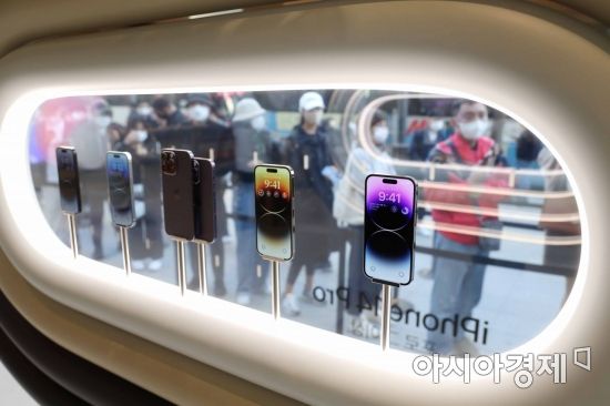 On the 7th, when Apple's new iPhone 14 series was officially released in Korea, citizens lined up at the Apple Store in Myeongdong, Jung-gu, Seoul to purchase the product. Photo by Moon Honam munonam@